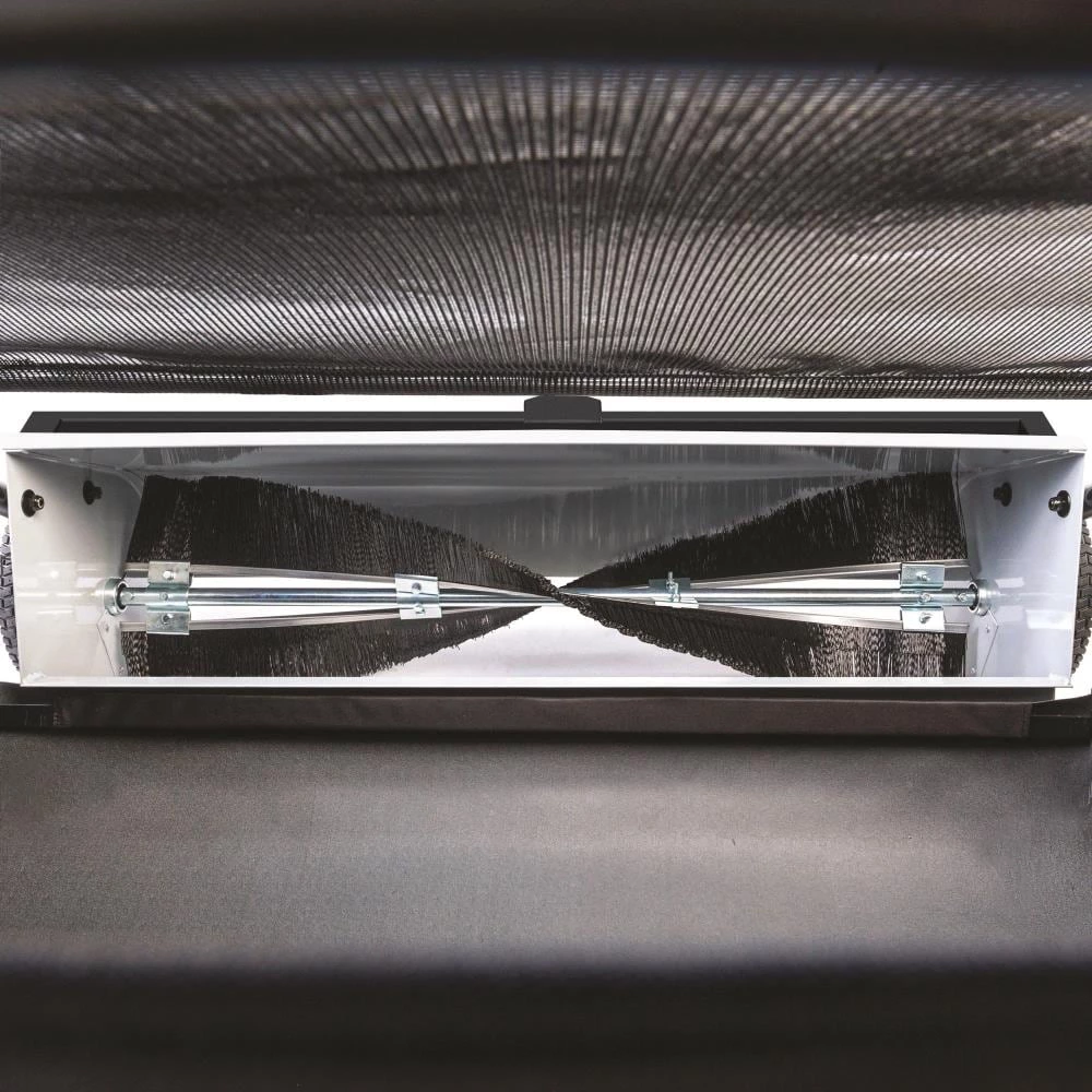 This lawn sweeper clears your yard of leaves, grass clippings, pine needles and cones, sticks, twigs and acorns and be offset left or right for simultaneous sweeping and mowing. Features a extra-large 22-cu ft heavy-duty collector bag and a 42-in sweeping path allowing you to get your lawn care finished quickly. Patented spiral brush sweeps more efficiently than standard sweepers and puts less stress on gears for long service life. “No-slip” positive lock height adjustment has numbered height settings that can be changed while viewing brush for proper adjustment. Hopper bag empties by pulling rope from the seat of your tractor – just reverse to debris or compost area, pull the rope and you’re done! Extra wide 9 in chute is less likely to clog, especially when sweeping damp grass clippings that can clump together. Reversible hitch allows for efficient level operation with any tractor hitch height – without the use of easy to lose spacer rings.