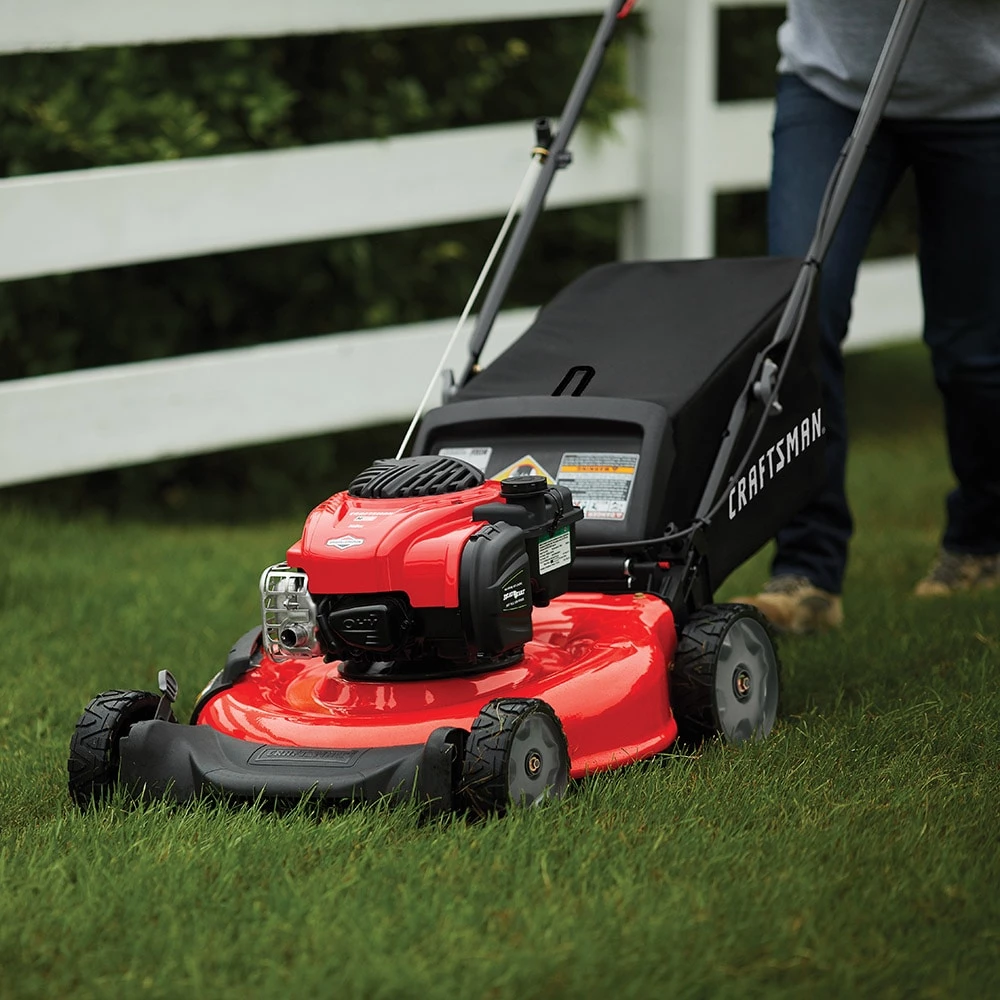 This CRAFTSMAN® M110 21-in push mower is ideal for smaller yards. It has a 140cc Briggs and Stratton® engine featuring one-step starting, no priming needed. The 3-in-1 deck allows you to mulch and help put nutrients back in your soil for a healthier lawn, bag for easy cleanup or composting, or side discharge for higher grass. The dual-lever 6 position height adjustment makes it easy for you to change the cutting height while mowing, while the adjustable handle provides optimal comfort. The CRAFTSMAN M110 will help you get the job done right.